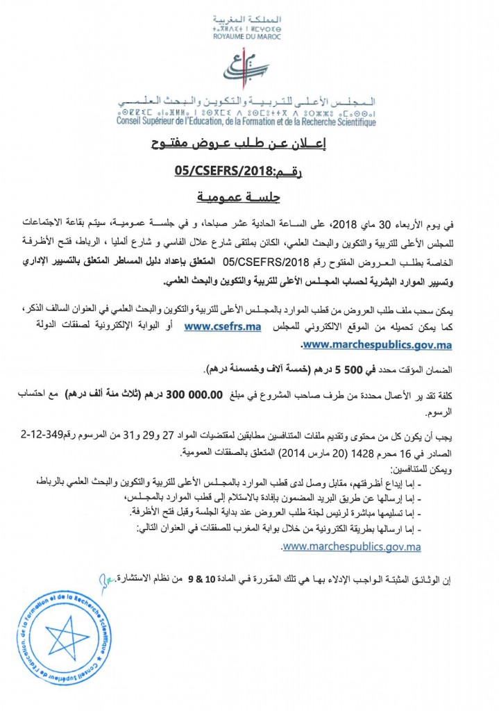إعداد دليل المساطر المتعلق بالتسيير الإداري وتسيير الموارد البشرية لحساب المجــلـس الأعلى للتربية والتكوين والبحث العلمي.