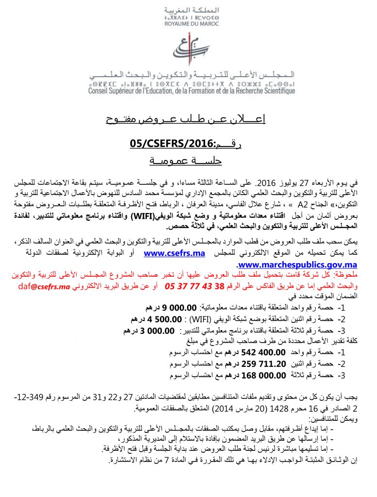 اقتناء معدات معلوماتية و وضع شبكة الويفي(WIFI) واقتناء برنامج معلوماتي للتدبير، لفائدة المجــلـس الأعلى للتربية والتكوين والبحث العلمي، في ثلاثة حصص.