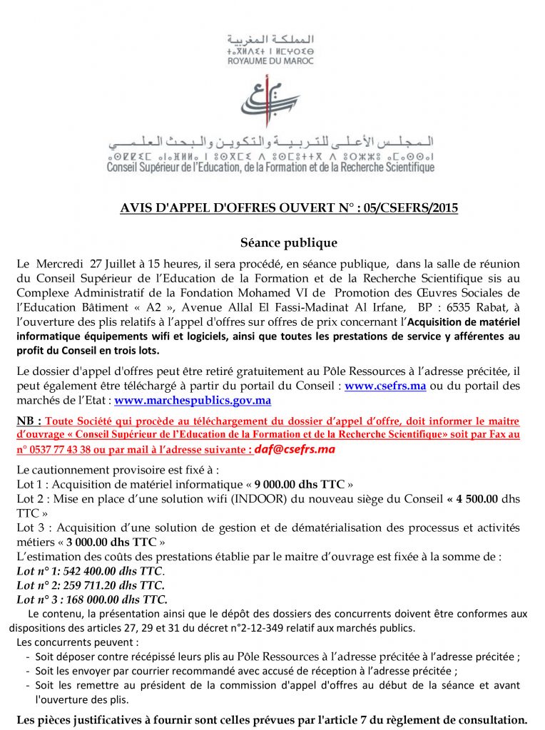 l’Acquisition de matériel informatique équipements wifi et logiciels, ainsi que toutes les prestations de service y afférentes au profit du Conseil en trois lots.